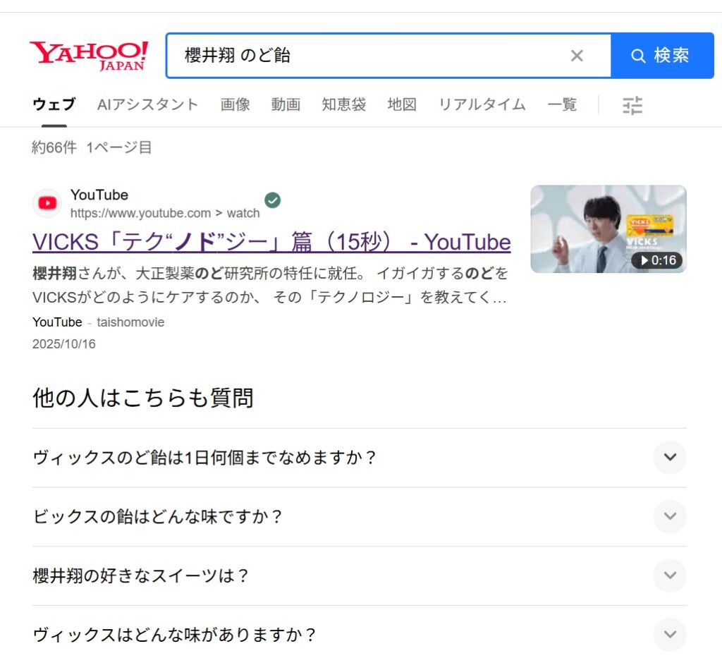 「櫻井翔 のど飴」と実際に検索してみた!